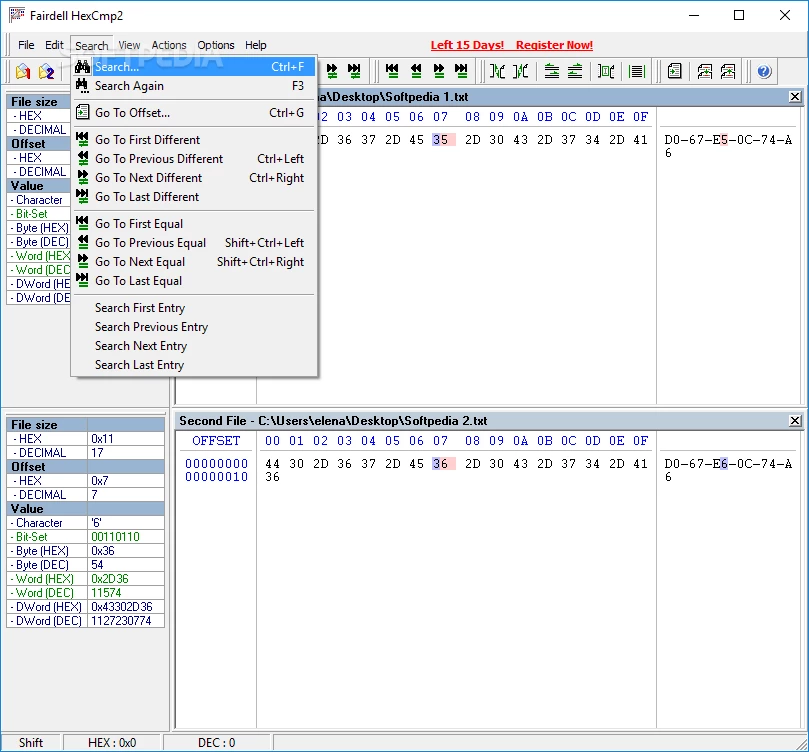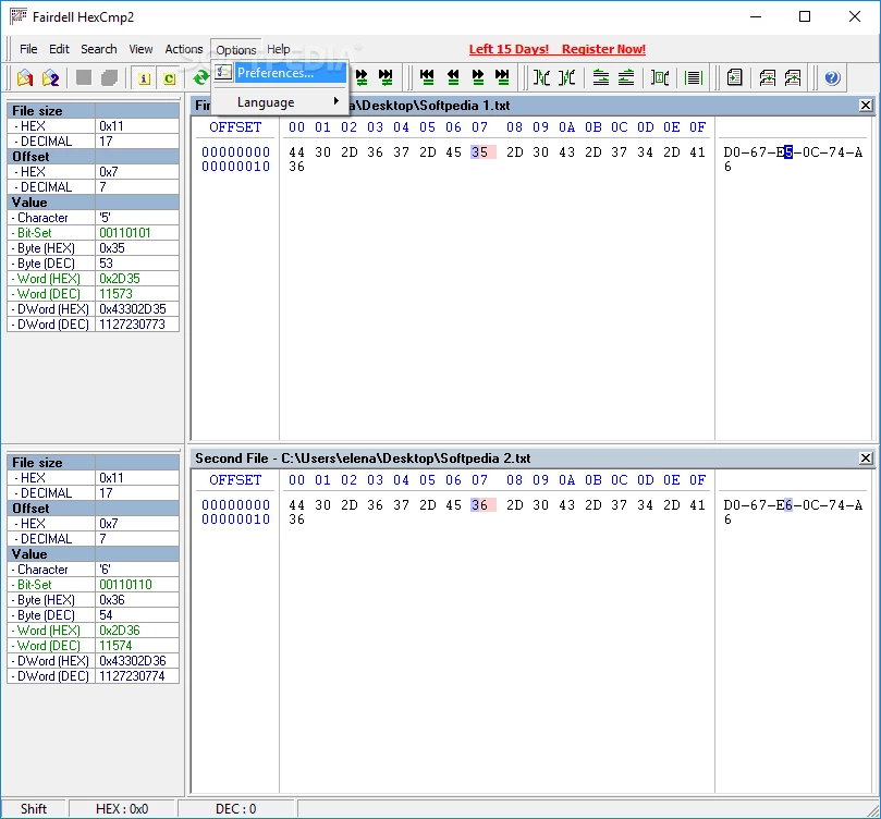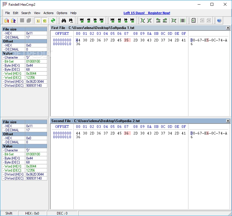 Interfejs jest prosty i oferuje szybką nawigację po różnych funkcjach. Niestety funkcja „przeciągnij i upuść” nie jest obsługiwana, więc do otwarcia dowolnego pliku konieczne jest użycie przeglądarki plików. Nieznane wartości są podświetlone na czerwono w obu plikach; wystarczy kliknąć wartość dostępną w kodzie szesnastkowym, aby uzyskać przydatne informacje, takie jak wartość szesnastkowa i dziesiętna, odpowiadające jej znaki, DWord oraz zestaw bitów.